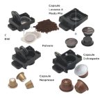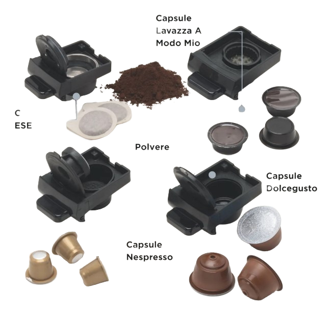– Cajón de cápsulas reemplazable: 4 adaptadores para diferentes cápsulas, adecuada para Nespresso, Dolce Gusto, Lavazza, monodosis de café ESE y café molido.