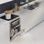 Trío es el único electrodoméstico 3 en 1 formado por una encimera, un horno y un lavavajillas, especialmente diseñado para aquellas cocinas de dimensiones reducidas pero que no quieren renunciar a funcionalidades y prestaciones. En dimensiones estándar, puedes cocinar en una encimera vitrocerámica de 4 zonas, en un horno de 41 litros y lavar hasta 6 servicios