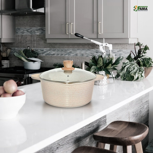 Esta cacerola de 24 cm es ideal para preparar una variedad de platillos, gracias a su diseño circular y su material de aluminio que garantiza una distribución uniforme del calor. Su revestimiento exterior antiadherente facilita la limpieza y evita que los alimentos se peguen. La tapa de vidrio templado permite monitorear la cocción sin necesidad de destaparla, mientras que el orificio para salida de vapor ayuda a mantener la humedad adecuada. Además, su manija de bakelita asegura un agarre cómodo y seguro. Compatible con cocinas a gas y eléctricas, esta cacerola es una excelente adición a cualquier cocina moderna.