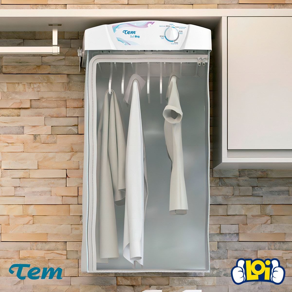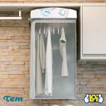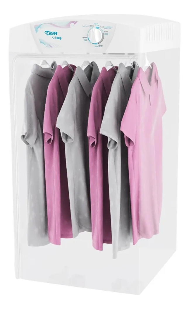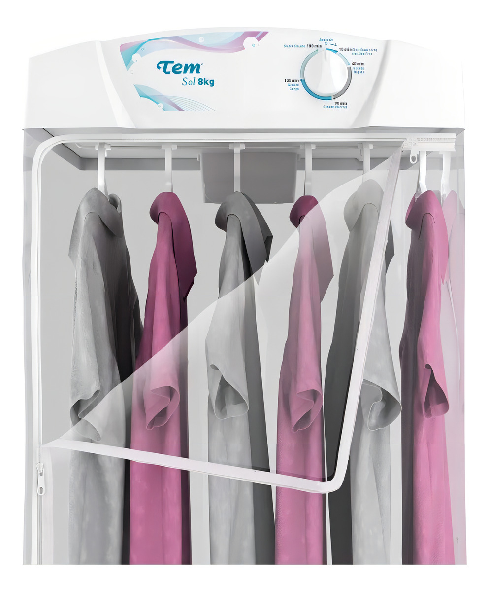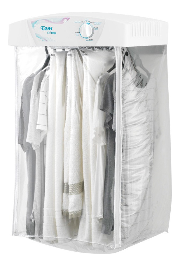 Secarropas Tem Sol de 8Kg de capacidad, en color blanco, con sistema de guardado fácil para que no ocupe mucho espacio cuando no esté en uso. Tendrá su ropa seca en poco tiempo y sin arrugas, ya que cuenta con bolsa de secado en PVC y 6 perchas extraíbles. Funciona con sistema de circulación de aire y los últimos 15 minutos de funcionamiento son en ciclo frío, seca sin desgastar la ropa y protegiéndola del frizz. Es el secarropas ideal, rápido, económico y de bajo ruido.